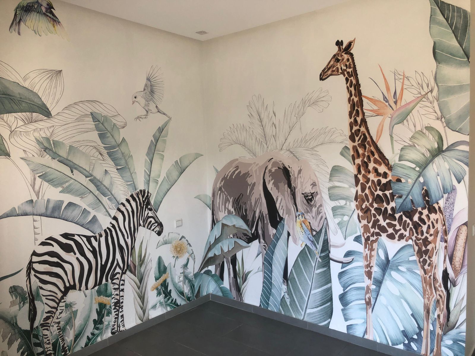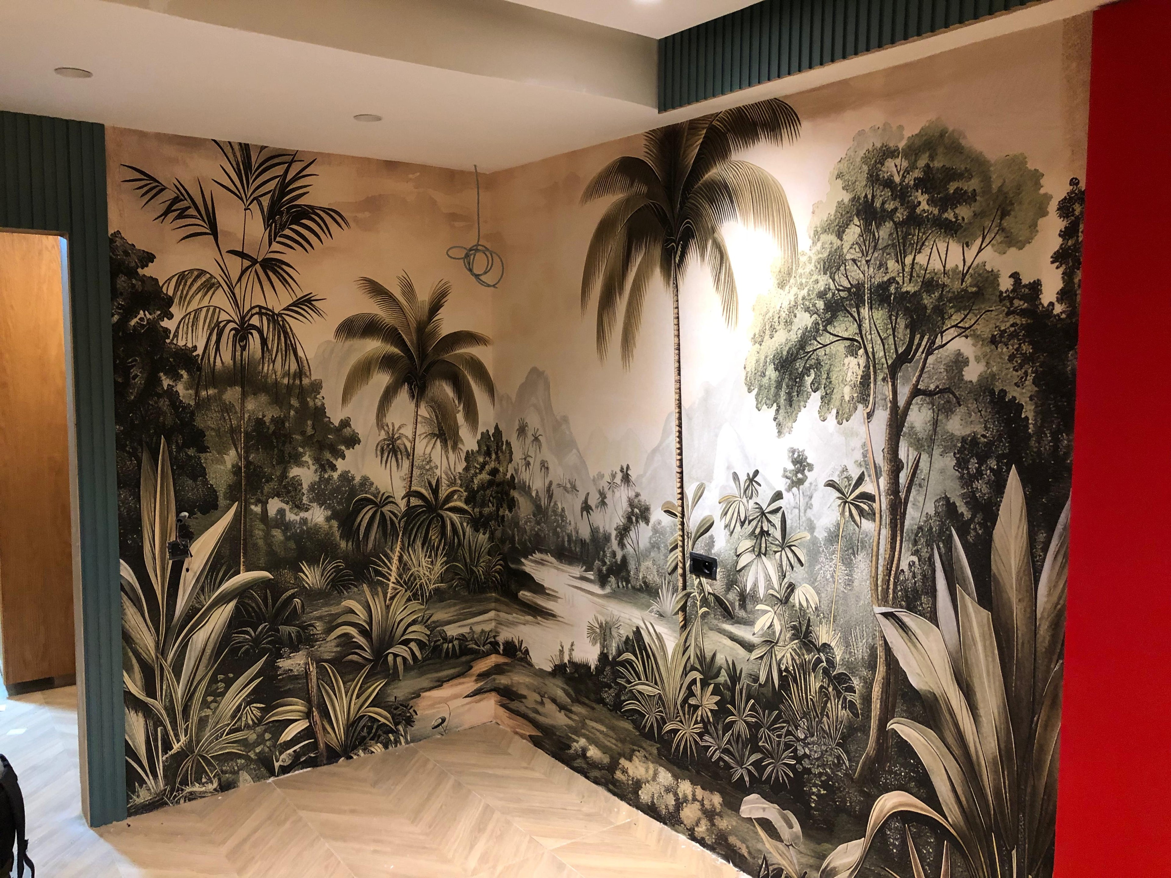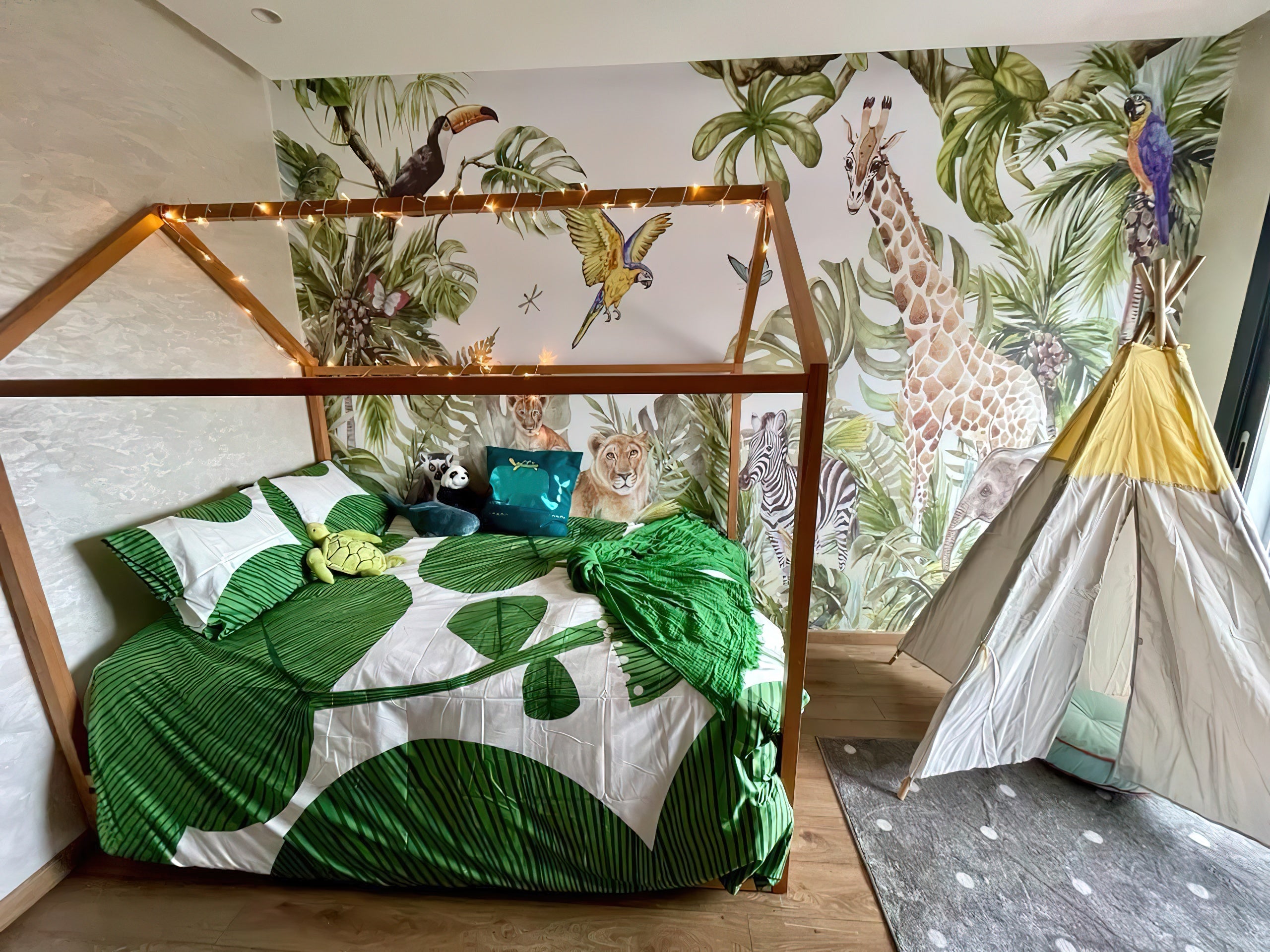 Papier peint personnalisé Morowall, conçu sur-mesure pour s’adapter parfaitement à la chambre. Le design jungle a été ajusté selon les mesures du mur et la disposition du mobilier, offrant un décor harmonieux, immersif et imprimé en haute définition.